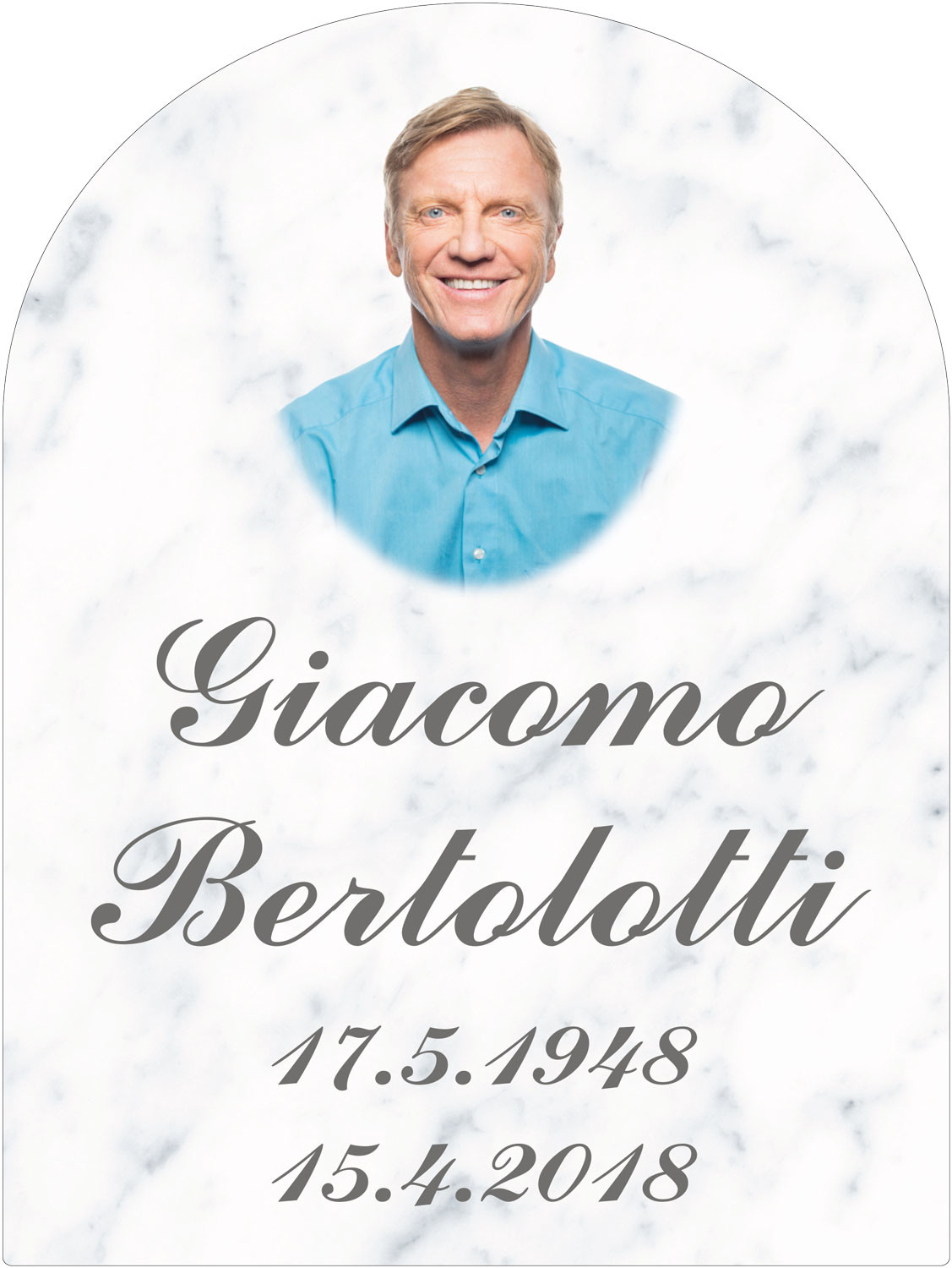 ESEMPIO 1: Forma: Cupola - Fondo: Carrara - Font: Commercial Script, colore Argento scuro