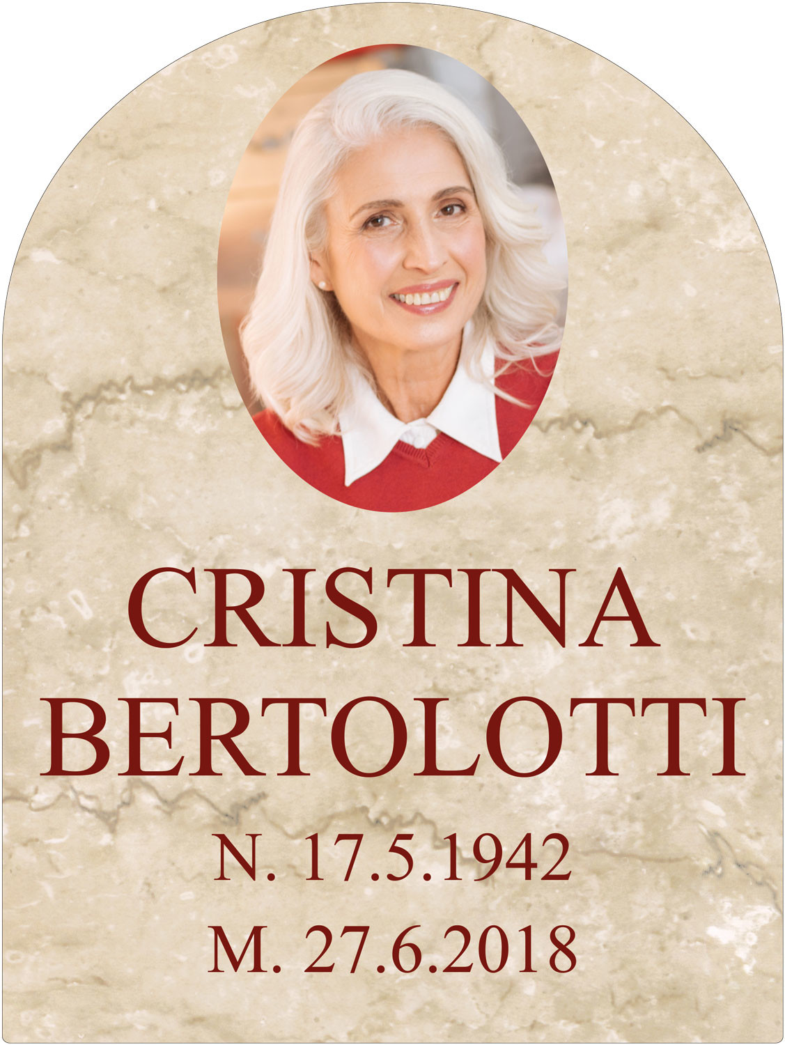 ESEMPIO 2: Forma: Cupola - Fondo: Botticino - Font: Times New Roman Maiuscolo, colore Bordeaux