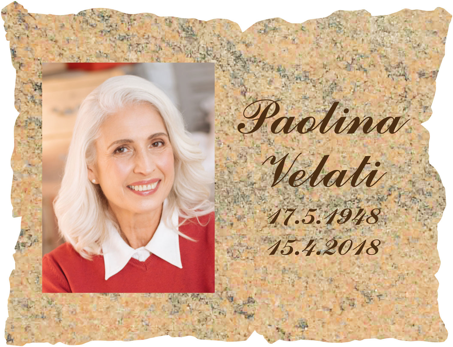 ESEMPIO 1: Forma: Frastagliata O - Fondo: Travertino 1 - Font: Commercial Script, colore Marrone scuro